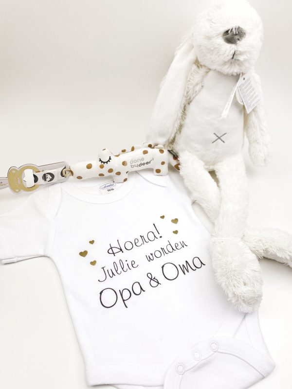 Verras opa en oma in spé met een originele zwangerschapsaankondiging of bestel een prachtig ingepakt babyshowercadeau – los of als compleet pakket.